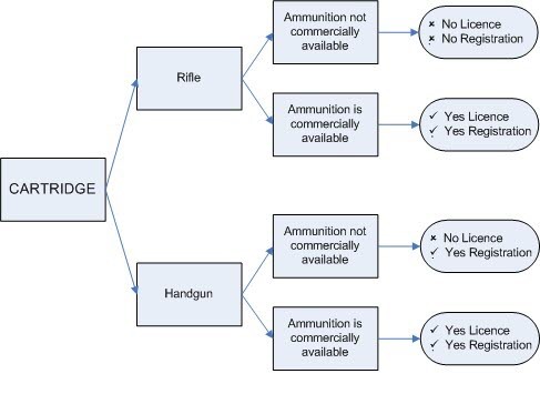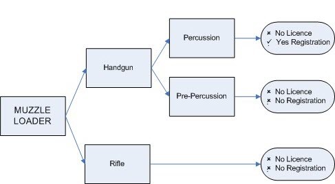 The diagram below provides a model for determining whether a firearm manufactured before 1901 requires a weapons licence or registration. Start by determining whether the firearm takes cartridge ammunition or is muzzle loading.